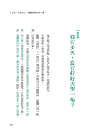 這本書最實際的部分,則是教我們大人,如何找回最原始的哭泣本能。你可以練習一個人,也可以親子、夫妻、朋友,或集體在周末夜,挑一部正中哭點的書、電影、照片,盡情地釋放淚水,好好地大哭一場。