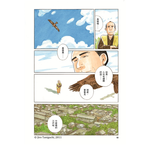 「我跟著漫畫裡這位每天計算腳步的大叔,第一次走進江戶。是的,文藝復興,不像佛羅倫斯那麼富麗堂皇,不像康雍乾盛世時的貴族氣息,大叔悶不吭聲地以松尾芭蕉的身影,以紅蜻蜓的翅膀,低吟出俳諧風格式的懷舊情緒。平靜的靈魂,方能享受一分一秒皆在變化之中的世界。」