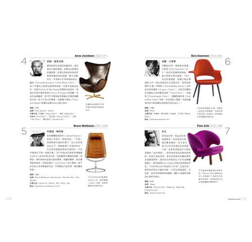 清楚易懂的圖文介紹國際品牌的風格理念及世界頂尖生活領域設計師簡介,小至一張經典設計師椅的由來、廣至國際上重要的設計展覽與議題都能看到。