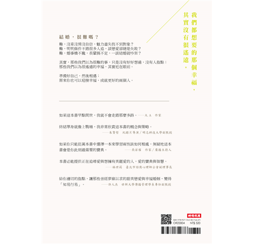 夫妻關係是身體成熟後的機緣、是敢愛與不敢愛的旅程分界點,也是生命道場入場券及豪賭的開始。終結單身就像上戰場,我非常欣賞這本書的概念與策略。──朱賢哲