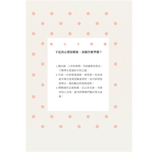 如此這般,「以結婚為前提」的交往就變得非常重要。如果你在人生的中程目標裡是有要結婚的,如果你在找的就是結婚對象,如果你不希望承受另一半因為沒那麼想結婚而帶來的不安全感,那麼,一開始就表明雙方心意絕對會讓你輕鬆很多。