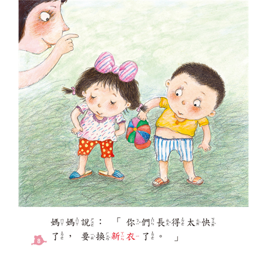 《長得太快了》小金魚長大要換魚缸,而叮叮噹噹的衣服也變太小了,他們該怎麼辦呢?