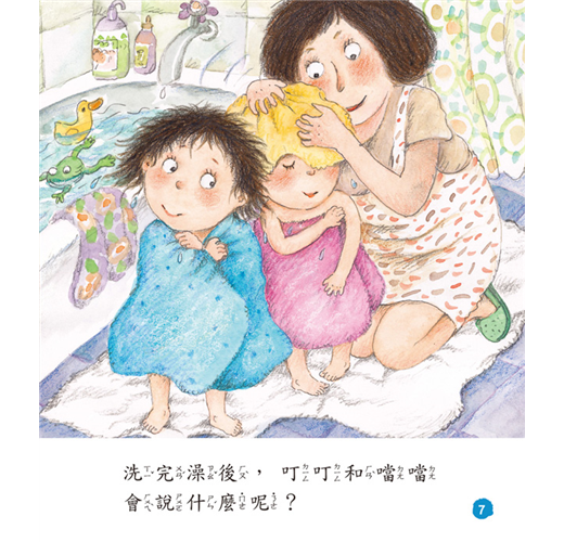 《誰先來洗澡?》浴缸裡放滿了水,猜猜看,今天叮叮噹噹的媽媽會決定誰先來洗澡呢?