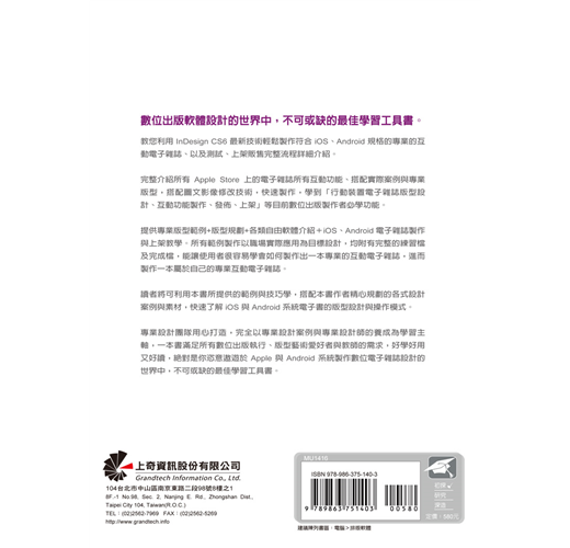 讀者將可利用本書所提供的範例與技巧學,搭配本書作者精心規劃的各式設計案例與素材,快速了解 iOS 與 Android 系統電子書的版型設計與操作模式。