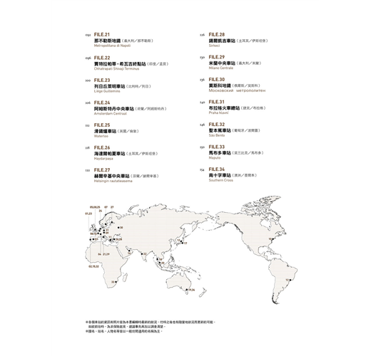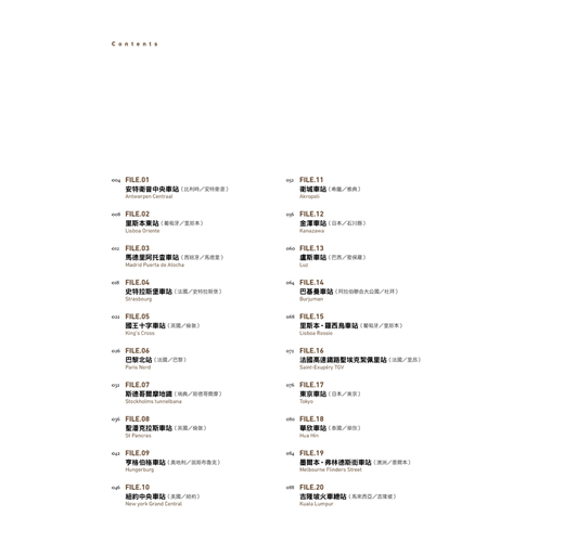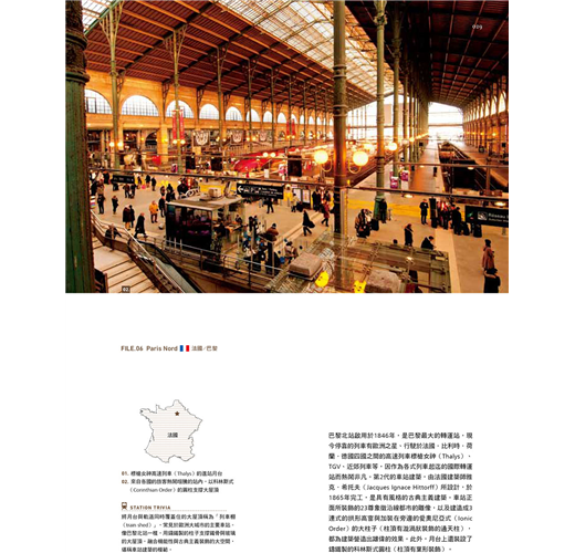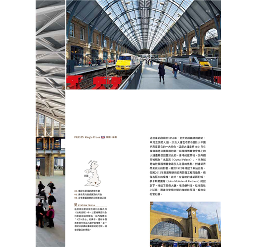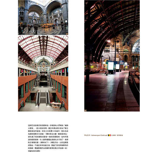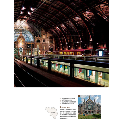 本書從洋溢著濃厚歷史氛圍的車站,到具時尚感、彷彿要通往未來的車站等,嚴選了世界各地的34個美麗車站建築,以洗練的文字描述每個車站建築的歷史沿革與設計理念。從融合了新舊工匠創意的倫敦「國王十字火車站」、呈現出中世紀大教堂莊嚴美的比利時「安特衛普中央車站」、宛如出現在沙漠中的海洋一般的杜拜「Burjuman地鐵站」,到彷如四面環海要塞的土耳其「海達爾帕夏火車站」等座落於世界各地的美麗車站們,將驚為天人的美麗照片形式一一呈現在本書當中。