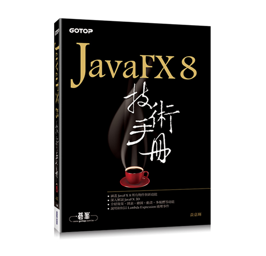 本書針對JavaFX 8,詳細介紹JavaFX 8所有物件與新功能,並深入解說JavaFX 3D與如何以Lambda Expression處理事件。讀者可由書中範例,循序漸進學習JavaFX,並由範例練習更能掌握JavaFX重點。
