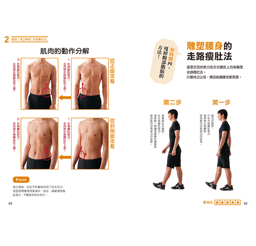 脂肪會屯積在肚子上,原因就出在腹肌沒有運動。如果只是單純的仰臥起坐,很可能會弄傷腰部。所以作者親身實證這一套「走路瘦肚法」。