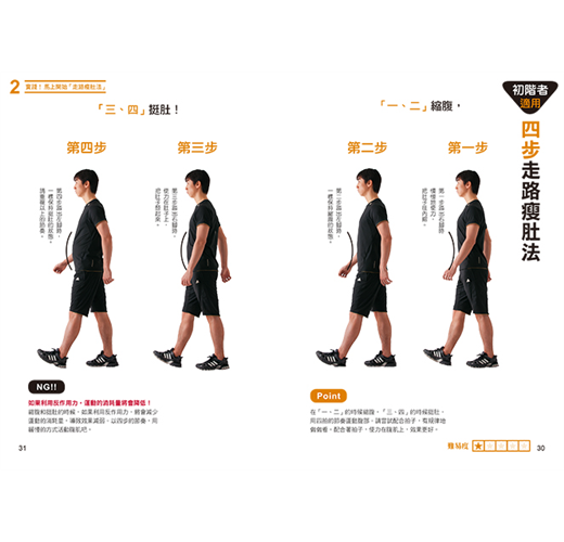 踏出第一步時吸小腹內縮、踏出第二步時腹部用力讓肚子鼓起。
