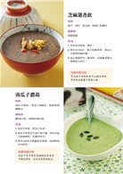 鮮蔬拌雙耳‧素炒纖蔬五絲‧木耳豆腐湯‧芝麻香煎豆腐‧芝麻紫菜飯‧紅棗黑豆粥‧黑豆蓮子雞湯‧小白菜炒香菇‧草菇豆腐鮮筍湯‧桃仁雞丁‧枸杞山藥牛肉湯‧海參淡菜羹‧山藥茯苓湯‧杜仲燒腰花‧淡竹葉茅根茶‧歸耆參朮飲