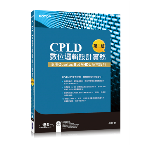 ‧學習最容易:由最簡單的圖形編輯設計開始學習數位邏輯設計,建立正確邏輯觀念。再以此為基礎,學習VHDL硬體描述語言。所有範例皆有詳細解說,透過step by step的方式學習,初學者可以更輕鬆的上手。