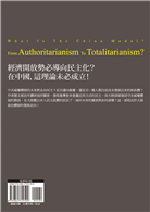 如此「上壓下承、菁英維護」的威權體制,怎可能於欠缺巨大且突發的事件(如「革命」)而垮臺?偏偏中共威權體制目前所面對的環境卻又欠缺這種革命性質突變的可能。本書論證了這種關係。至於中共在不可見的未來可能的表現,不僅以現有的證據難以斷定,其發展出人類過去所沒有的政體,亦非不可能。