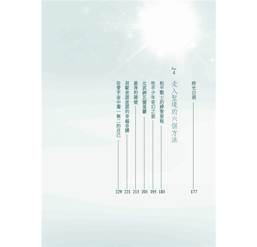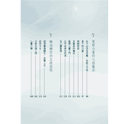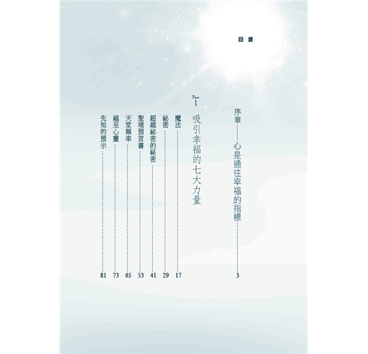 透過本書傳授的吸引幸福七大奧祕、覺察心靈力量的七個魔法、看見靈魂永生的五段旅程、邁向奇蹟的六個方法,你將愈能與內在的神性緊密連結,發掘最真實的自我,明瞭自己這一生所為何來,一切美好與轉變將開始發生……