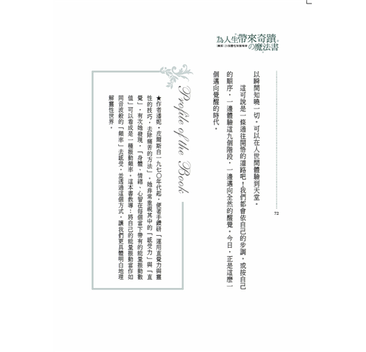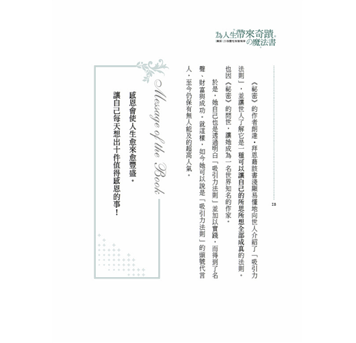 本書收錄《祕密》、《魔法》、《牧羊少年奇幻之旅》、《聖境預言書》、《天堂頻率》、《與神對話》、《荷歐波諾波諾的幸福奇蹟》……等二十五本風靡全球改變人生的絕妙好書,首度以圖解方式重現書中教導與精髓,每篇並佐以最饒富智慧的雋語,讓你我的意識心智在閱讀之中朝靈性提升全面敞開。