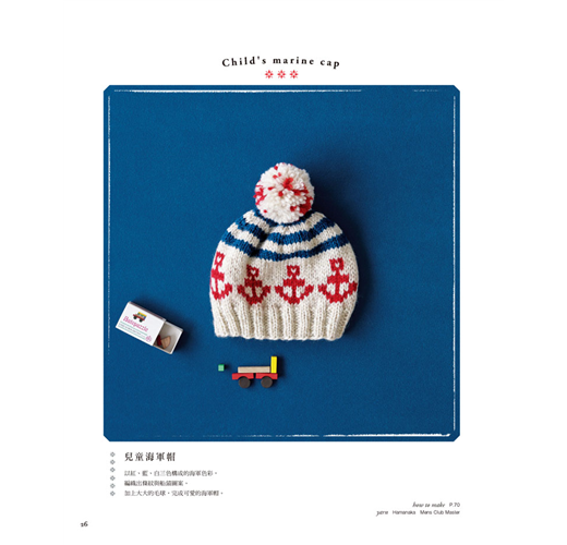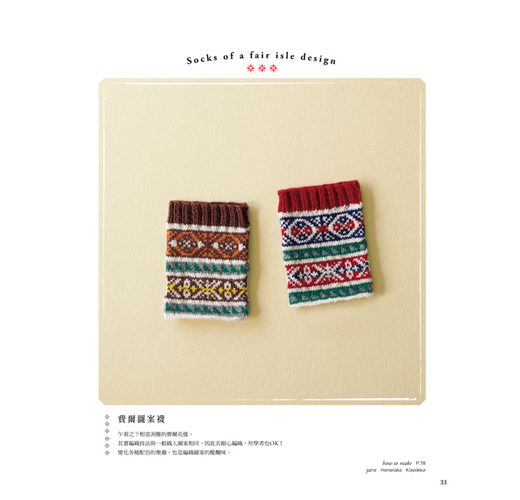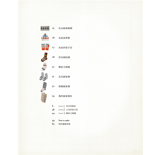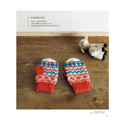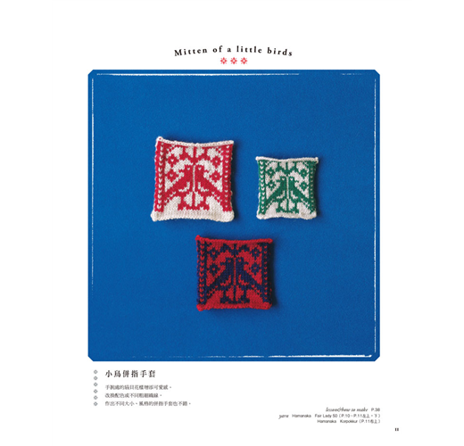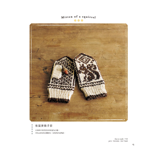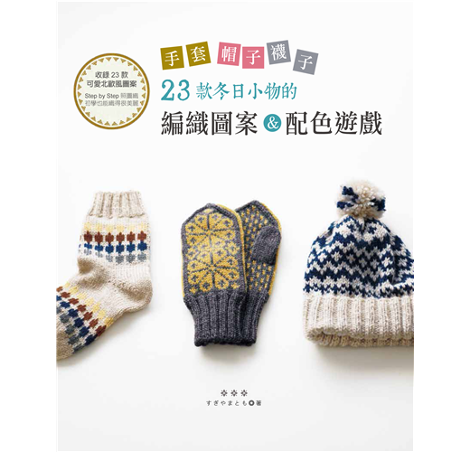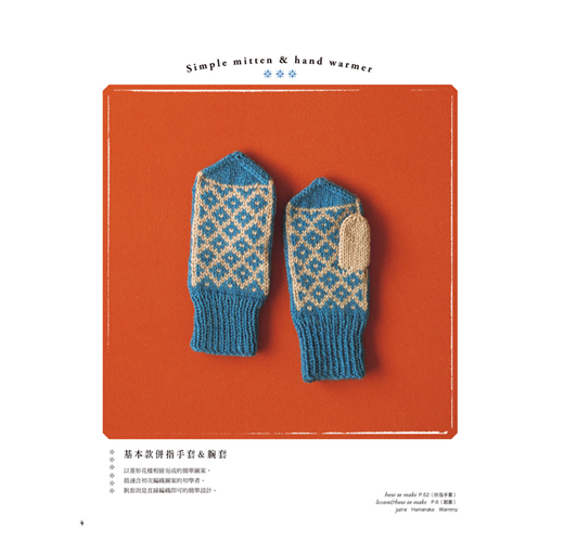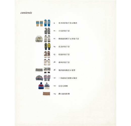 在冬日大衣與各式厚重衣物的包裹之下,一眼就能看到的帽子、手套等小物,就成了最亮眼的配飾。北歐風格的手織品著重色彩搭配,圖案上也有豐富的變化,但編織的針法卻不一定很難。除了示範織品以外,作者也針對織入圖案的配色,額外編織了許多不同顏色的組合,作為不同的選擇參考。