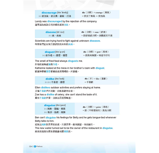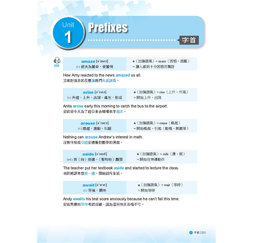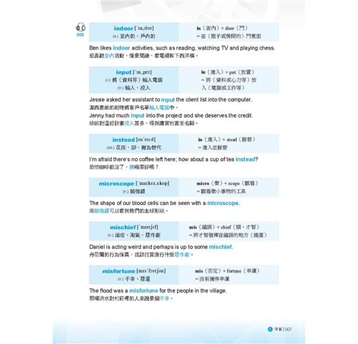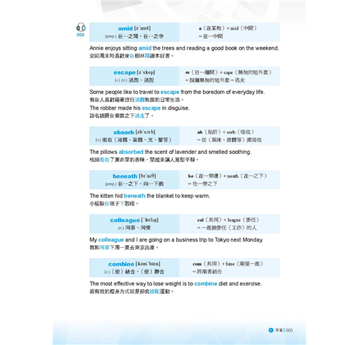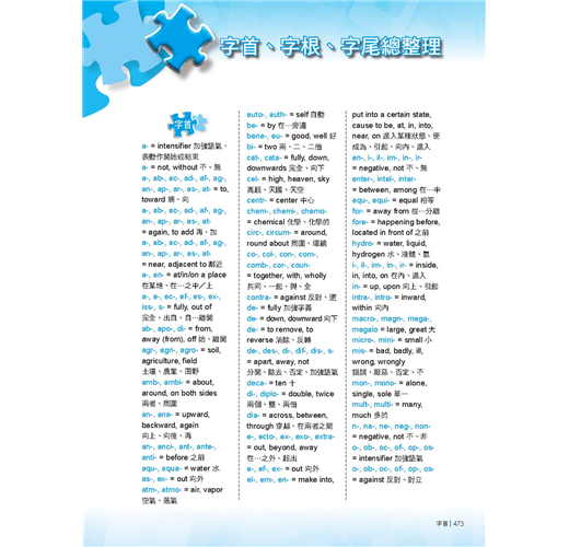 單字拆解:囊括GEPT中級測驗的所有字彙,依字首、字根、字尾逐一解構,讓字義有跡可循,便於記憶。