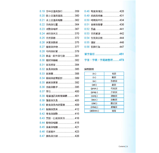 例句應用:搭配單字詞性的相關例句,熟悉單字的應用,讓單字學習更為紮實、靈活。主題分類:另將未能拆解的單字作主題式分類學習,強化記憶點,增加學習效率。