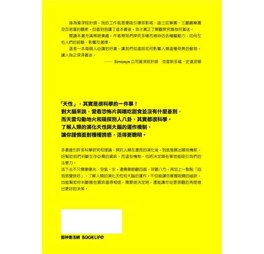活下去不只需要陽光、空氣、水,還需要眼觀四面、耳聽八方,再加上一點點「自我感覺良好」。了解人類的演化天性和大腦的運作,不但能讓你掌握吸睛的祕訣,也能幫助你判斷哪些資訊值得相信,需要做決定時,還能讓你從更客觀的角度做出更好的決策。