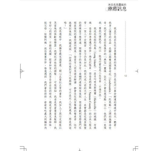 大膽敢言且倍受喜愛的靈媒特蕾莎.卡普托是美國當紅電視節目〈長島靈媒〉的主角,她開啟了自己世界的大門,邀你前去體驗她與「另一邊」溝通的卓越天賦。這位不論是與家人、商店老板或往生靈魂說話,都始終逗趣、坦率、實際的靈媒,在四歲大時開始與靈溝通,但一直到她三十三歲才完全接納自己的天賦恩賜。她生活過得不錯,但也飽受長期焦慮之苦,後來證明,這樣的苦來自於忽視自身的能力。特蕾莎一開始通靈便領悟到,傳達了靈的訊息並釋放掉那份能量之後,她感覺好多了。從那時起,她就運用自己的非凡恩賜,幫助療癒失去親人的傷痛。