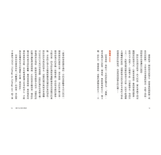 在這本「諷建築」的書中,她以半個外國學生的角度,深刻入裡地描述康乃爾建築系大學部的狂人訓練營。雖然,過程中滿是殘酷的淘汰篩選,處處留下駭人聽聞的極度壓力、淚水與辛酸;但這不就是美國、台灣乃至於對岸的北京、上海各大跨國建築事務所執業環境中的現實寫照嗎?