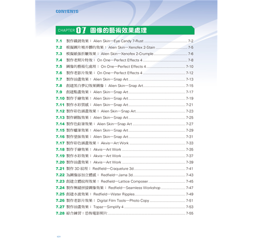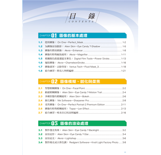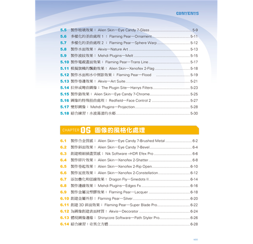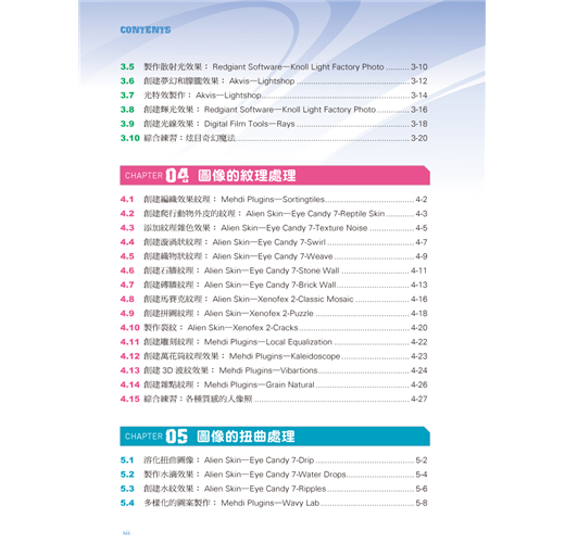 本書講解過程中,作者群根據各種外掛濾鏡的處理功能與特色,經過討論與修改,精心挑選了許多容易展示其外掛特色效果的圖像素材,同時詳細對該章節所敘述的外掛濾鏡工具,針對其工作方式和原理、使用方法、參數設置及應用效果進行了詳細的介紹,並為每一個外掛濾鏡設計了典型的應用實例。