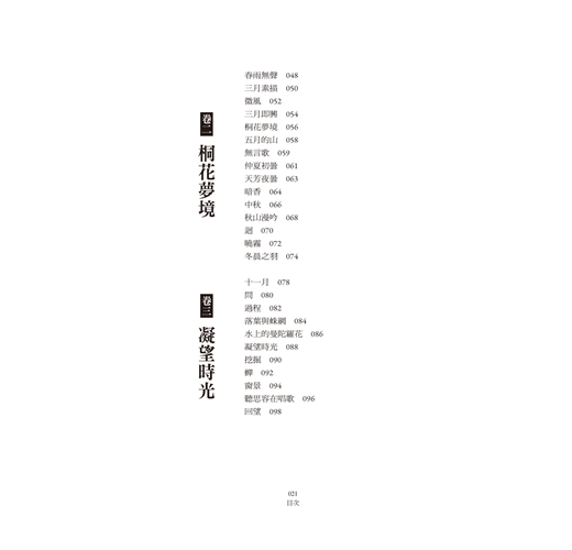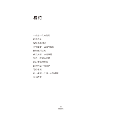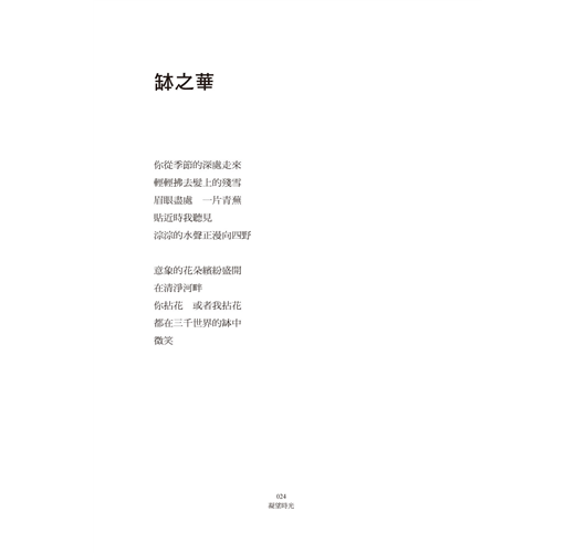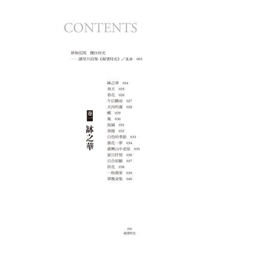 《凝望時光》收錄作者2007年至2014年間於各副刊及詩刊發表的作品,共分為四卷:卷一《缽之華》為十三行以內的短詩集;卷二《桐花夢境》屬自然抒情之作;卷三《凝望時光》則為藉境向內思維觀照;卷四《在旅途中》為旅遊他方之心情。