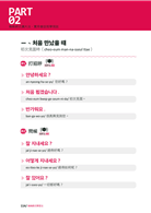 內容從「打招呼」、「問候」、「自我介紹」、「道別」、一直到「聽懂問題」。在學習後,第一次開口說韓語,就能夠擁有零失禮的禮貌應對,輕鬆擄獲韓國人的心。