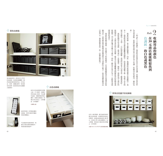 我家的收納,多半屬於隱藏式。因此,我選擇的收納盒都不是很醒目。基本上,我會把東西全都收進櫥櫃或抽屜中。如果都收到櫃子裡,也就不必太拘泥外在顏色。不過,一旦打開收納櫃,看到的也是全白或全黑,感覺會更好。