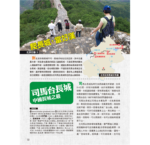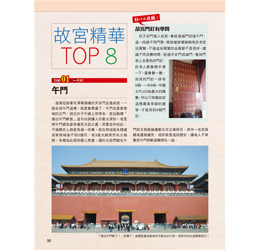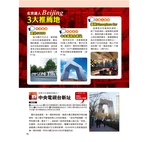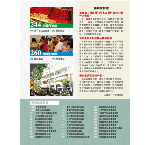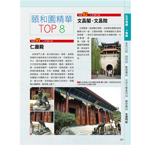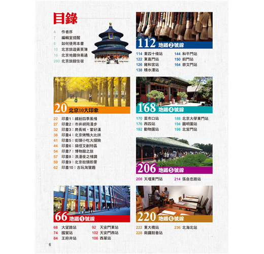 以地鐵線為北京旅遊主軸,每條地鐵線獨立分出數個重點地鐵站,以地鐵站周邊的美食、購物點、旅遊景點將北京城市風貌勾勒完整。使得北京旅遊分區清楚簡潔。全書規畫了北京已開通重要的7條地鐵線,28個停靠站,包括專爲奧運開設的奧運支線,旅遊實用性超強。