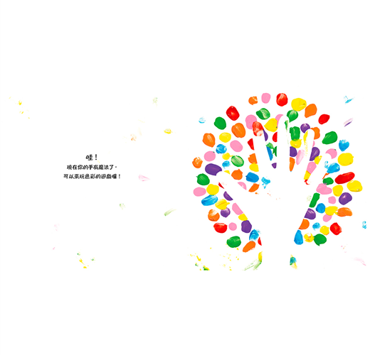 閉上眼睛數到五,色彩的魔法就出現了!孩子的手瞬間變成一隻神奇的魔法手,隨著各種簡潔明快的指令,顏料在書頁上自由地流動、混和,彷彿有了生命一樣,在觸摸、塗抹、書頁開闔時瞬間變化。色彩與手指的魔法,任誰都無法抗拒!