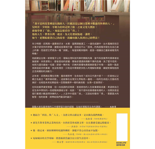 在科技業界廣受尊重、但一向低調的邱再興,首度將他的人生故事撰寫成書,希望將自己從生命中學到的一些經驗與讀者分享。他說:「我不是科技業裡最有錢的人,但應該是這個行業裡少數過得快樂的人。」人生中什麼該「捨」、又該如何看待「得」,需要莫大的智慧。他的故事,將帶給我們最深的啟示。