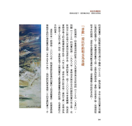 「收藏是鑑賞之門」、「鑑賞是收藏之鑰」,以藝術收藏市場的發展現況而言,這真是最昂貴的學習。他的體驗揭示了藝術豐富人生的各種情節、情懷,讓我感受深刻,覺得終於有人說出我心中的悸動,每每拜讀都令我獲益良多。
