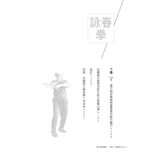 本書內容有不同論述,期望能夠給愛好詠春拳的學習者更多關於葉問宗師傳下來的功夫武術,增進學習者更多關於詠春拳的認識和了解,使其進而有更多的投入和更廣的傳承。這裡我再次重申葉問宗師生前對門下弟子一再鼓勵的一段話:「今天有機會你們都不把詠春拳練好,他日中國人一定要跪在外國人面前,求他們教你詠春拳」。所以,這裡我特別引出古文書中蘇軾寫的一篇文章―〈留侯論〉的開篇一段話:「古之所謂豪傑之士,必有過人之節。人情有所不能忍者,匹夫見辱,拔劍而起,挺身而鬥,此不足為勇也。天下有大勇者,卒然臨之而不驚,無故加之而不怒,此其所挾持者甚大,而其志甚遠也。」正因如此,詠春拳的學拳者應該走出正確的方向,既不是強調打殺、也不是強調各種動物形態,更重要的是能夠每事以科學引證,所以,十九世紀末以來,一向重視科學的歐美日等國家紛紛有人投入詠春拳的學習行列,這也使得我們中國人有了危機意識,是故,詠春拳的學習者應有更長遠的志向,所以說,中國人一定要把詠春拳學好,更要往下傳承下去。