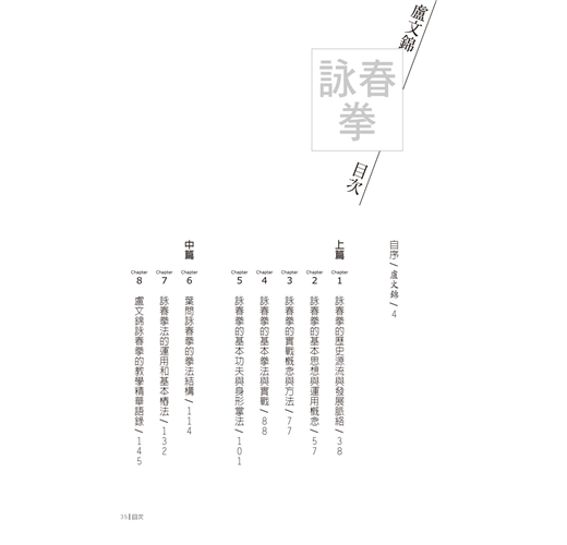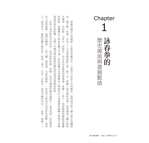 本書的內容主要是以本人近四十年的教學心得筆記一一編寫串聯起來的,不強調見招破招或是如何打倒對方的機械式寫法。如果學拳者抱著如何殺戮的思想,就無法體會詠春拳的生命精神,希望打倒對方這也是極端錯誤的想法。在我近四十年的教學生涯中,訓練過來自軍中或是特勤的人員,他們是國家與社會安寧的保衛者,主要任務在於維持國家與社會的秩序和安全,使他們在執勤過程中可以保護自己並且完成維安的任務。一般平民百姓來學拳,當然也不能抱著殺戮或是擊倒對方的思想,如果要傷人何必學功夫,隨便拿把刀或是槍,豈不是更快?所以,學拳者的心態要擺正,端正思想後才能進入詠春拳術的奧妙殿堂。