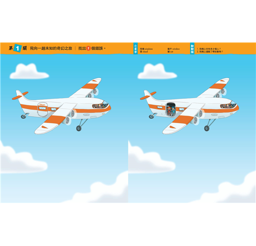 這是一本繪本,也是一本益智遊戲書。在每一關的畫面,都有著乍看相同、實際上卻有細微差異的兩張圖,就如同傳統的找碴遊戲般,讓人一玩就上癮,而且每翻一頁,困難指數便不斷攀升。全書共有160個錯誤,每一關還有英文單字學習設計,以及好玩的謎題。你有本事完成這趟不可能的任務嗎?