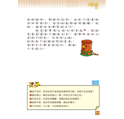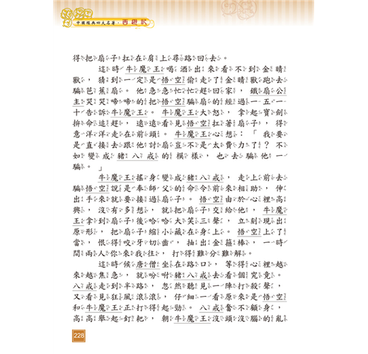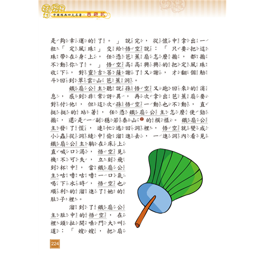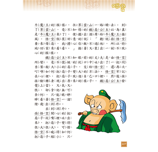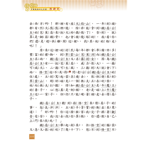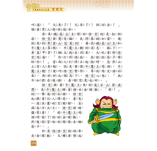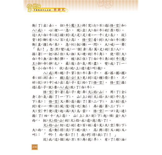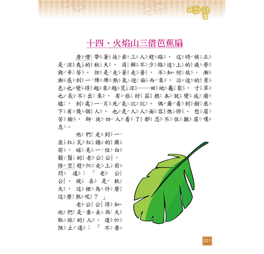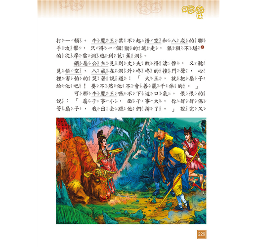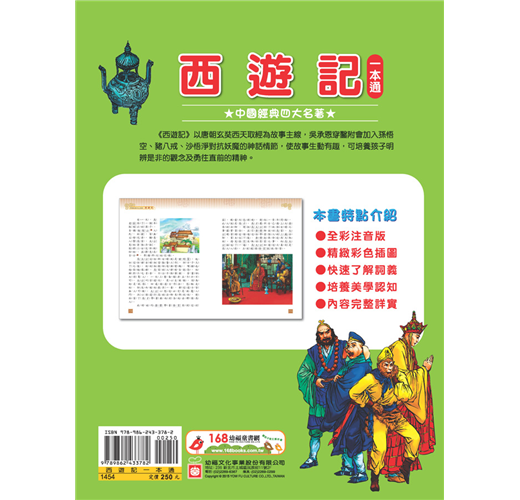 《西遊記》以唐朝玄奘西天取經為故事主線,吳承恩穿鑿附會加入孫悟空、豬八戒、沙悟淨對抗妖魔的神話情節,使故事生動有趣,可培養孩子明辨是非的觀念及勇往直前的精神。