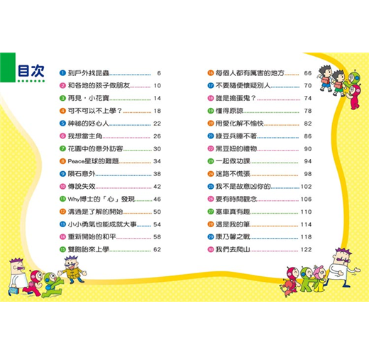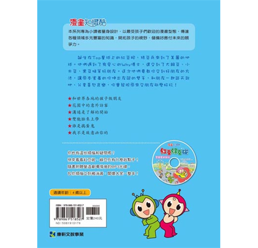 2.生活故事學成長:主角紅豆妮與綠豆兵引導小朋友學習身體保健、生活常規、課業學習、手足與同儕相處等,培養良好的品德。