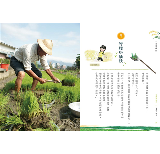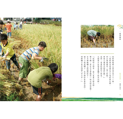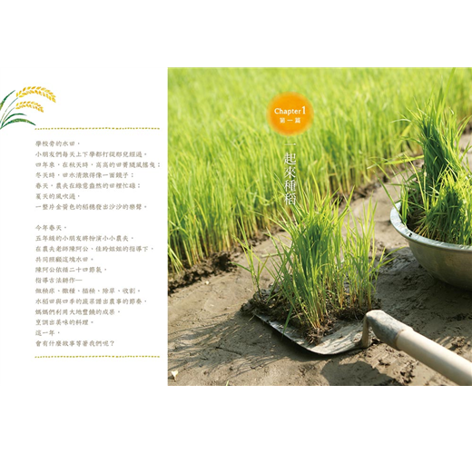 這本書的場景是在宜蘭縣員山鄉的深溝國小。我們將這一年來小朋友參與食農活動的點點滴滴,編印成適合兒童與家長一起學習的食農教育手冊。本書的第一篇紀錄了小朋友向老農夫學習古法種稻的過程;第二篇則以「節氣米食」描述伴隨小朋友長大的節氣米食點心,同時也紀錄宜蘭媽媽、阿嬤的米食食譜;第三篇是書寫小朋友巡禮四季菜園時發生的故事,也紀錄宜蘭在地的季節味道。讓小朋友與農夫的互動中,除了明白作物生產過程的辛苦、樂趣,更是認識家鄉的風土與在地食材。而媽媽與阿嬤將家庭的味道帶到校園中,以在地食材烹調節氣米食與點心,媽媽跟阿嬤的味道是一個家庭的記憶,這些記憶將伴隨著孩子長大、出外求學與工作,維繫著孩子與家鄉之間的認同與慰藉,知道自己從何而來、從哪裡找到心靈的力量。