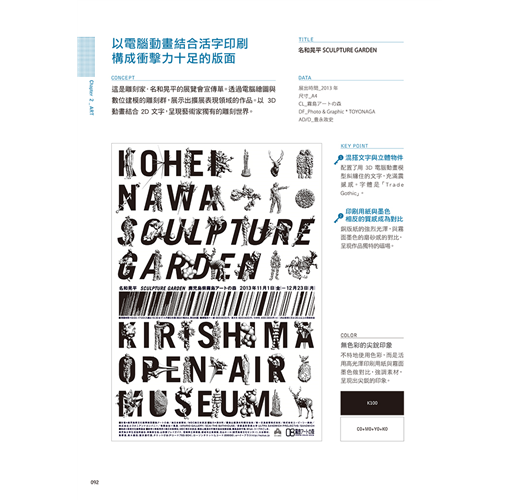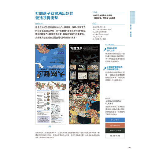 本書涵蓋了日本最新流行的海報與傳單範例,涵蓋許多電影、藝術展、音樂、戲劇等廣宣作品,由於觀眾往往眼光極高,廣宣設計必須掌握洗鍊的風格,準確傳達演出資訊和作品氣氛,此外還有許多必須注意的設計眉角。本書將以各類實例為你解說設計重點,例如:引人注目的字體和配色設計、主視覺的搭配、內文的編排方式、用紙的選擇、背面的版型、易懂的地圖指引...等。