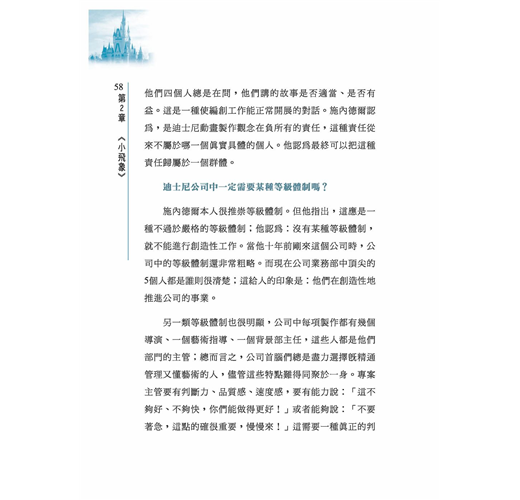 把想像力變成有創意的動畫片,是需要強有力的執行力的,同時也需要嚴格的操作程式,這是迪士尼管理中很有特色的地方。因為單純的想像並不是一件很難的事情,年幼的兒童基本都能夠有很好想像力,單純的動畫製作也不是很難的事情,一般的技術人員都有這個能力,但是把想像力變成吸引人的動畫片,這就需要極高的智慧和科學 的管理方法。迪士尼就做到了!