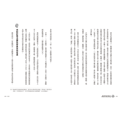 「記憶力年年衰退讓我充滿危機感,抱著死馬當活馬醫的心情讀完《1分鐘超強記憶法》,沒想到真的讓我不再嚴重忘東忘西,就連讀中學的孩子也獲益不淺呢!」--(A.I 40多歲 專利法律事務所祕書)