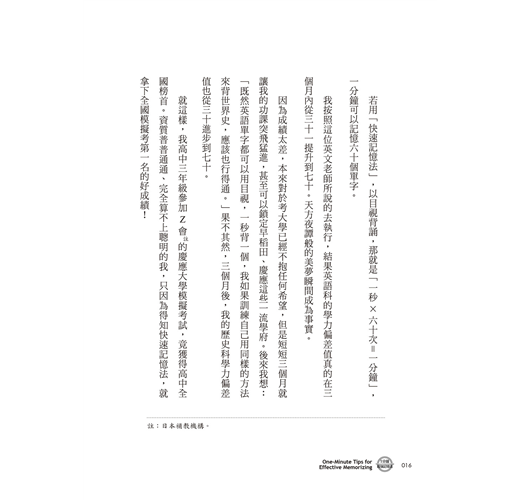 我自己就是在資質平庸的條件下起步,卻能夠在全國模擬考試中名列榜首,這完全是因為學會一分鐘記憶法的緣故。我鑽研「記憶的運作機制」,嘗試過各種各樣的記憶術,我把「最快速度提升最大效益的記憶法」加以體系化,就成為「一分鐘記憶法」(構成一分鐘記憶法的四個招式,是以現有的腦科學為基礎,加入我個人的創意所完成)。