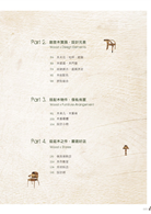 書中並放大解析各個關鍵性的「設計細節」,例如木作設計必須特別注意的木紋肌理(花色)、木頭的染色配色、拼貼接合手法、鑲嵌鏤空、邊角處理等細節。完整的設計元素與概念之後,內文進一步提供木材質「傢俬佈置」搭配靈感。