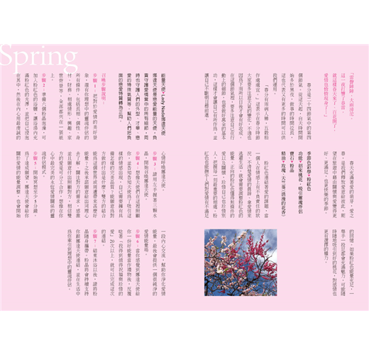 因為代表春天的粉紅色連結著愛的課題,當一個人在情感上有不負責任的狀況、不清楚愛情的真諦、拿愛情來逃避生活,就需要調整體內粉紅色的能量。正向的粉紅色懂得無條件的愛與關懷,珍惜自己也珍惜別人,把握每一刻最重要的相處,同時粉紅色也能撫平人們對愛情有不滿足的回憶。如果粉紅色能量充足,一舉手一投足都會充滿魅力,可能隨時隨地吸引到好的桃花,對感情也會擁有選擇的權力。