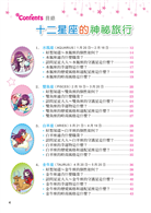 本書由星座女巫──史黛拉、血型博士──克拉拉,分別介紹十二星座及四種血型。星座部分,每一章先以漫畫敘述希臘神話故事裡的星座由來,再介紹各星座的性格特質、幸運物品、適合職業、速配星座、適合該星座的打扮與髮型、守護星等。血型部分則另塑四個角色代表四種血型,每一章先以漫畫述說這四人的故事,凸顯血型個性,再介紹各血型的性格特質、適合職業、速配血型、適合該血型的打扮與髮型、人際關係、減肥法、讀書法、飲食習慣等。讓女孩們從中了解自己的特色,並且加以發揮,進而成為充滿自信且閃閃發亮的美麗淑女!