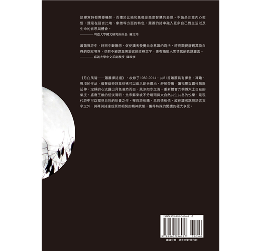 《月白風清──蕭蕭禪詩選》,收錄了1982-2014,共81首蕭蕭具有禪意、禪趣、禪境的作品,循著這些詩章彷彿可以進入朗天曠地,舒展奔騰,讓視覺與靈性無限延伸,定靜的心流露出月色湛然而白、風涼如水之清。重新體會六朝傅大士自在的氣度,盛唐王維的恬淡清明,北宋蘇東坡不分晴雨與大自然共生共息的悅樂,是現代詩中可以窺見自性的珍貴之作。禪與詩相隨,思與情相依,縱任讀者跳脫語言文字之外,與禪與詩達成冥然相契的精神狀態,獲得特殊的閱讀的極大享受。