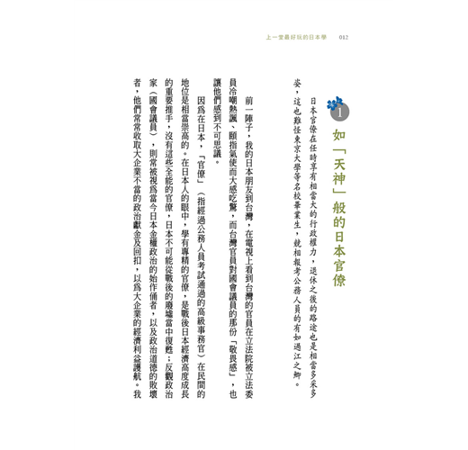 此外,作者更將深入淺出地從政治、社會、專業崇拜、國際觀等四大範疇,進一步為讀者們介紹最真實,以及你不知道的日本,例如其實日本官僚與庶民生活存在極大落差;比起法院裁判,日本社會更看重「恥感」所帶來的約束力;面對層出不窮的食安危機,日本媒體聯手封殺某食品大廠的廣告整整兩年;面對右派勢力的崛起,今後日本將在亞洲造成什麼樣的影響?