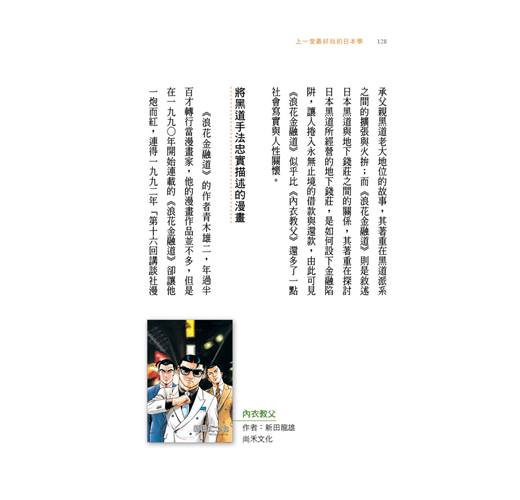 《上一堂最好玩的日本學》這本書,便是依據我這七年來引介給同學的漫畫以及上課的內容所編寫而成的,希望讓無法上這門課的社會人士,也能夠藉由閱讀漫畫來了解日本。日本是距離我國最近的工業大國,但是我們對日本的理解卻又是何其貧乏。日本不是只有拉麵及溫泉,更不只有AKB48及109辣妹,期許讀者們能透過這本書,學習如何從漫畫來理解真正的日本。就讓這本書來帶領大家認識一個你不知道的日本吧!