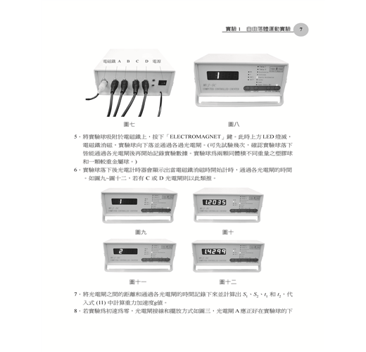 6.實驗球落下後光電計時器會顯示出當電磁鐵消磁時開始計時,通過各光電閘的時間。如圖九~圖十二,若有C或D光電閘則以此類推。