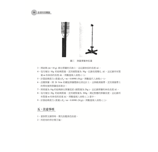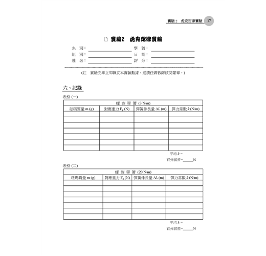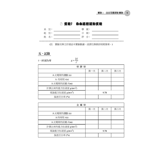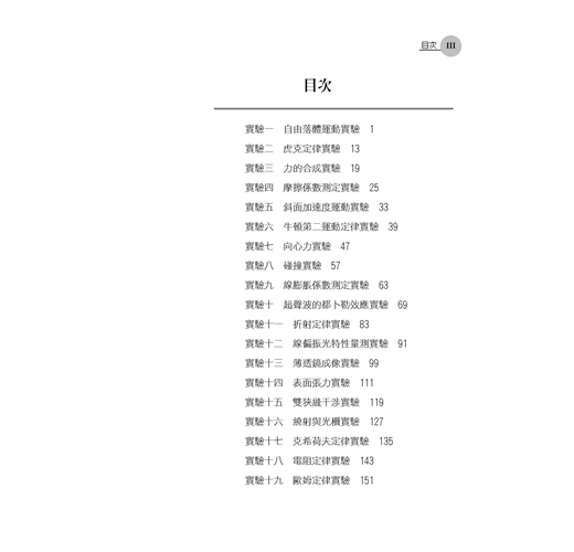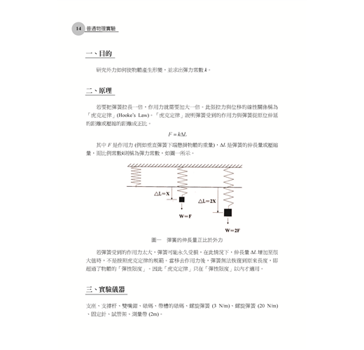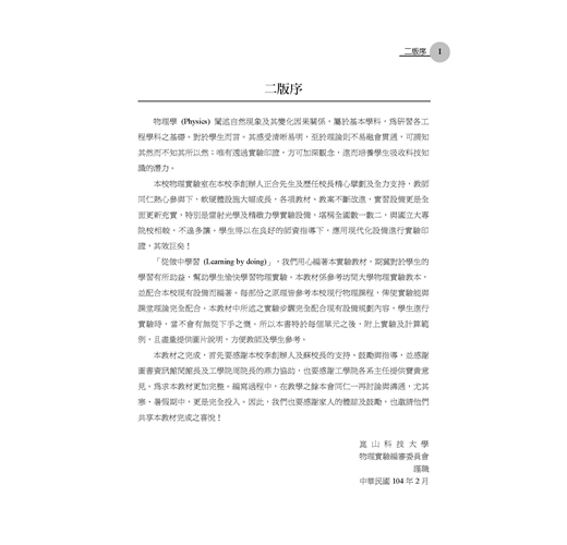 「從做中學習(Learning by doing)」,我們用心編著本實驗教材,期冀對於學生的學習有所助益,幫助學生愉快學習物理實驗。本教材係參考坊間大學物理實驗教本,並配合本校現有設備而編著。每部份之原理皆參考本校現行物理課程,俾使實驗能與課堂理論完全配合。本教材中所述之實驗步驟完全配合現有設備規劃內容,學生進行實驗時,當不會有無從下手之慨。所以本書特於每個單元之後,附上實驗及計算範例,且盡量提供圖片說明,方便教師及學生參考。