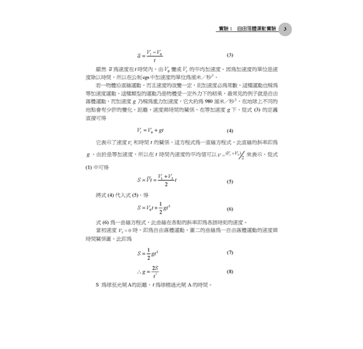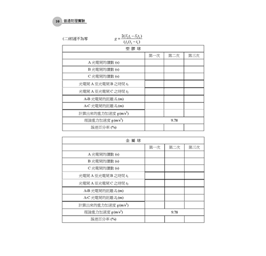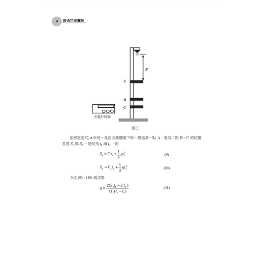 7.將光電閘之間的距離和通過各光電閘的時間記錄下來並計算出S1、S2、t1和t2,代入式(11)中計算重力加速度g值。